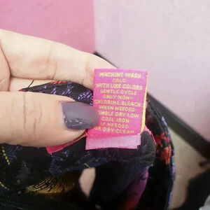 Multi color background with black floral pattern overtop.