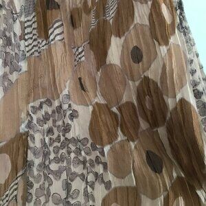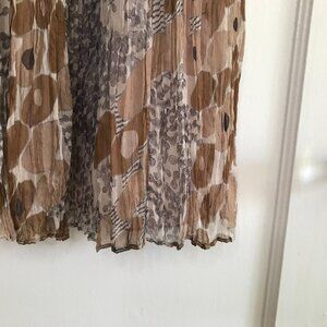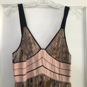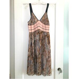 Lovely cocktail dress from French designer Catherine Malandrino constructed from an airy pleated silk chiffon fabric in a beautiful watercolor print evoking flowers and leaves. Stitched down "cummerbund"-like pink fabric enhances the waist and bust. Black spaghetti straps. Side zip closure.