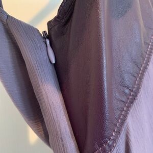 Stunning lavender silk and leather dress by Catherine Malandrino. Gently Preloved with a minor wear, as shown. Wear is not at all noticeable, when worn, however I have highlighted them for you to see. Just gorgeous on. Fully lined. Labeled size 4, but fit me as a 0 and a 2, as it is cut small. Underarm - underarm 15". Waist 26"-28" (flowy)