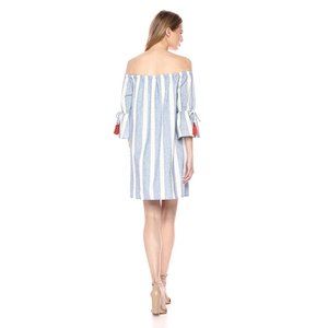 Adorable off-the-shoulder dress with blue and white stripes and orange tassel tie details on the sleeves.