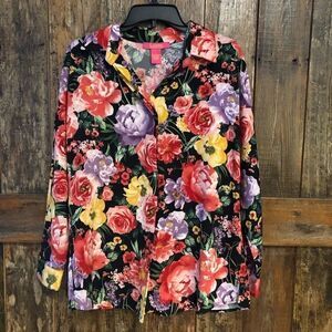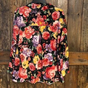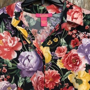 Beautiful pull-on, V-neck, Collar, faux button up with large floral design top. The back has a high pleat style design.