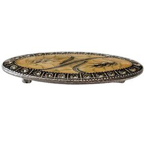 This Vintage Catherine Popesco Oval Brooch is very collectible. It is designed and crafted by the famous French designer Catherine Popesco. This oval-shaped pin is crafted from a silver tone base metal, featuring wheat sheath design engravings with a yellowish background. The edge is studded with individually bezel-set clear faceted rhinestones along the segment, black enameled outline. It is topped with a clear resin coating over the metalwork, showcasing a gleaming showpiece. The clear resin coating technique is distinctive among Catherine Popesco's authentic costume jewelry. It measures approximately 2.25 inches in width and 1.1 inches in length. The back of this pin is marked "Catherine Popesco France and the maker's logo on an oval-shaped plaque. It has a secure pin that is easy to fix on the back and can be firmly attached to your clothing