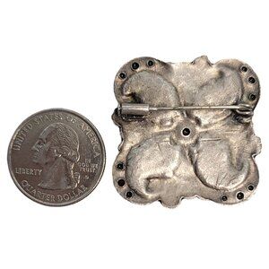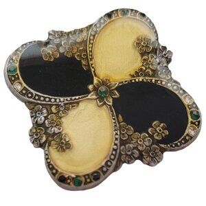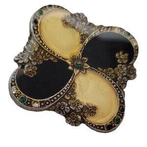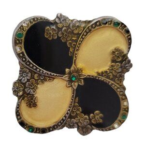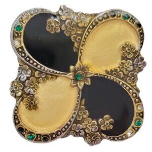 A unique vintage piece by Catherine Popesco. This Catherine Popesco Brooch features a black and yellow enameled square shape brooch accentuated with green rhinestone and floral designs. Measure approximately 1.4-inch. The trombone clasp functions properly. This brooch is in good condition consistent with age and normal use.