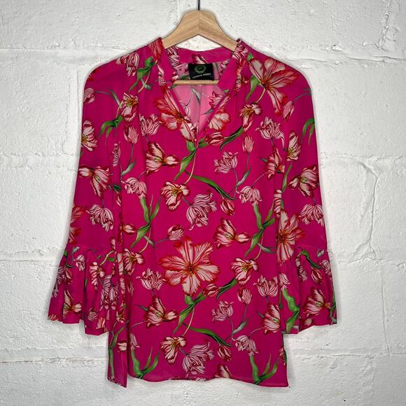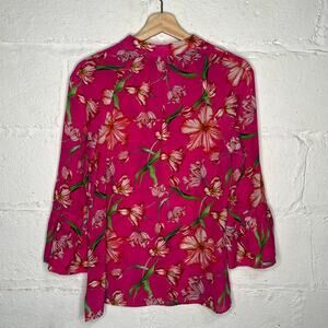 Catherine Prevost Women's Pink Floral Silk Ruffle Bell Sleeve Blouse Size Small
