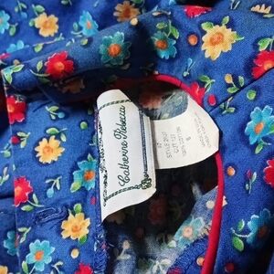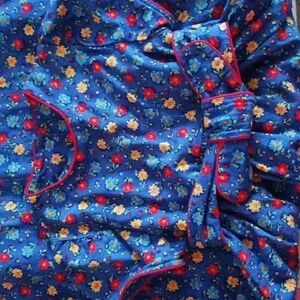 Red Piping around neckline, bottom of sleeves and upper bodice tie.