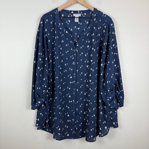 Catherine Top Women's 3X Blue White Sailboat Print Roll-Tab Sleeve Preppy Retro