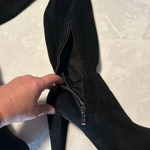 Catherine boots Size 10 Black velvet Over the knee with tie at top Zipper Heels See pictures for measurements Excellent used condition No holes or stains