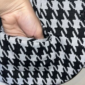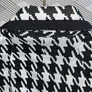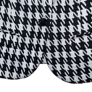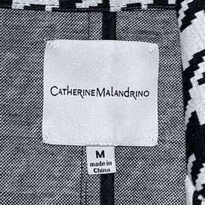 Introducing a stunning black and white houndstooth knit blazer jacket from Catherine Malandrino, available in women's size medium. This jacket is perfect for any occasion, whether it's for travel, casual wear, or business attire. The long sleeves and mid-length coat provide both comfort and style, while the one-button sleeve button style adds a touch of elegance.