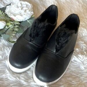 Super super cute platform sneakers in pebbled black vegan leather. Slip on style with adorable faux fur on the tongue. 1.25” platform in white.