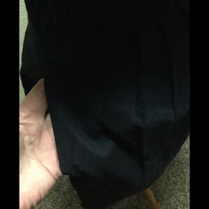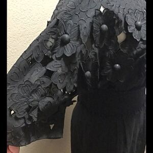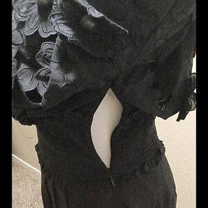 Gorgeous black dress with strategic cut-outs and beautiful black flowers with their centers big black "knobs"! Size 2. Worn once. In new condition. Side zip, slash usable pockets and lined. I have shown this dress in various degrees of exposure to show detail. The blackest photograph is the closest to is actual color.