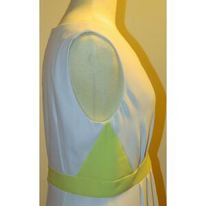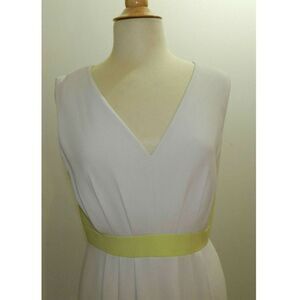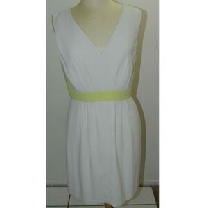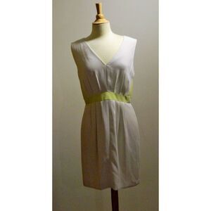 A Catherine Malandrino dress that is cream with lime green accents. This V-neck dress is fully lined with a invisible zipper back closure. It is also pleated in the front.