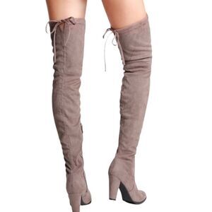 Catherine Malandrino "Sorcha" Taupe Over the Knee Boots Taupe Faux Suede/Stretch Gold-tone Hardware Back Self-tie Closure Almond Toe Inner side Zip-up Closure Lightly Padded Insole 3.25" Heel Approx. Flat Lay Dimensions: Shaft 23"/ Calf Circumference 8.5" Absolutely GORGEOUS Boots!!!!