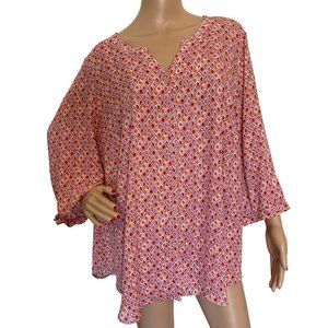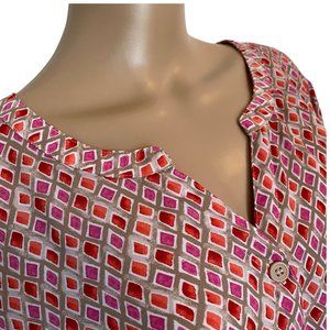 This is a pre-owned and gently worn 1X ladies top that is free of stains, rips or damage. Featuring attractive pink, maroon and magenta diamond patterns, it is a must-have addition to plus size womens clothes. As with all of my plus size shirts for women, it has been maintained in a clean and smoke-free environment.