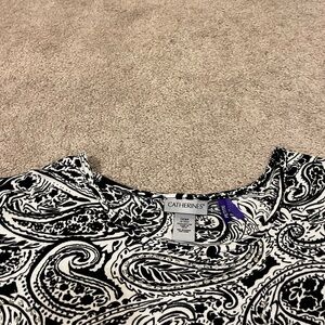 In good shape! Sleeve are 3/4 length. Top is a petite fit so length from shoulder to hem is 24 inches. Cute paisley print with sequin accents! Perfect for work or a night out! Offers always welcome!