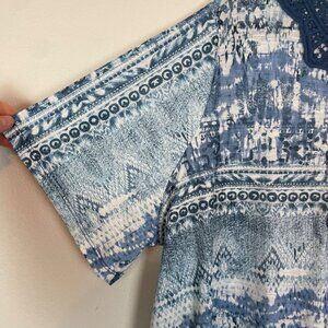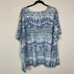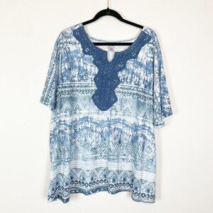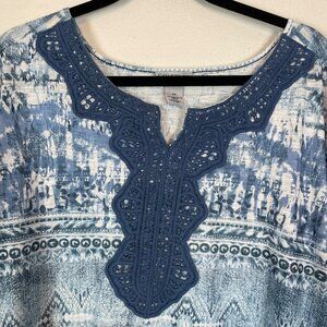Catherines 3X Blue Bohemian Print Crochet Lace Detail Neck Long T Shirt Tunic