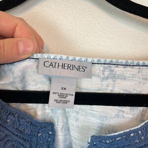 This is a blue and white crochet lace neck detail short sleeve t shirt tunic shirt from Catherines.