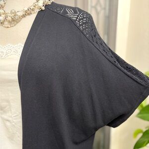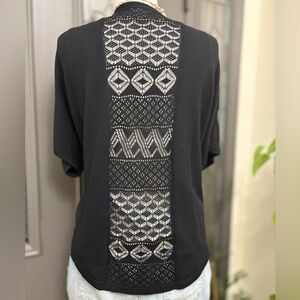 Relaxed and feminine lace panel on the shoulder and down the center of back with an open front, short sleeves and a fluid drape sweater