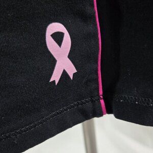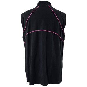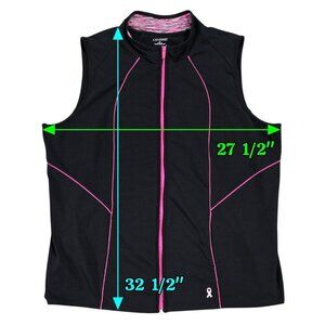 Good used condition, with no stains or tears. A stretchy black vest, with pink trim. Full zip closure, with pockets. Has the breast cancer pink ribbon at the bottom.