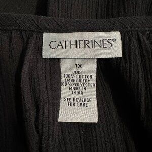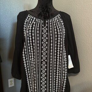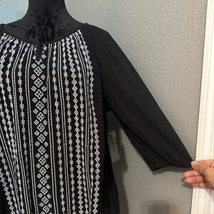 Catherines Blouse 1X Black White Embroidered Boho Peasant 3/4 Sleeve Artisan NWT