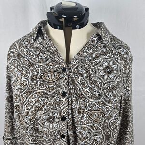 Catherines Blouse Womens 1X Petite Brown White Paisley Buttons Roll Tab Sleeve
