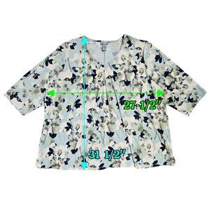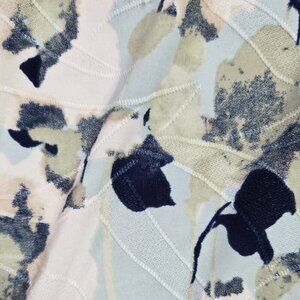 Good used condition, with no stains or tears. A romantic blue and green floral top, made of a stretchy and comfortable liquid knit. Has a textured effect. Has a curved v-neck.
