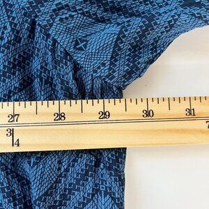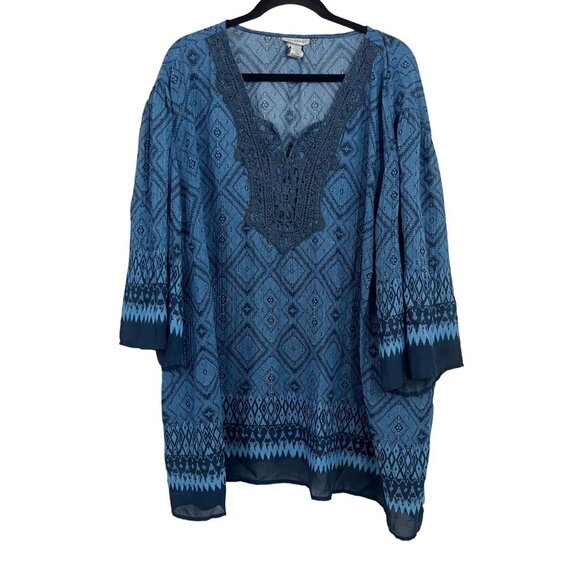 Catherines Blue Ikat Print Boho Top Crochet Bib V-Neck Flowy - Size 3X