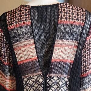 The unique sheer crochet back panels and 3/4 sleeves create a relaxed and comfy fit, ideal for layering. In excellent, gently pre-worn condition with no visible flaws, this oversized cardigan is a must-have for those who love tribal-inspired fashion.