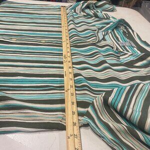 This tunic shirt features a lightweight, breathable rayon fabric with vibrant striped design. Button-front closure and roll-tab sleeves enhance its practicality.