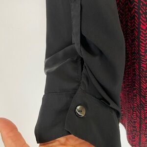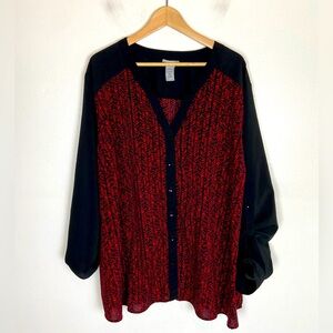 Catherines Chiffon Button Down Top Size 4X Red & Black Roll Tab Sleeves V-Neck