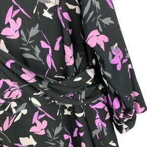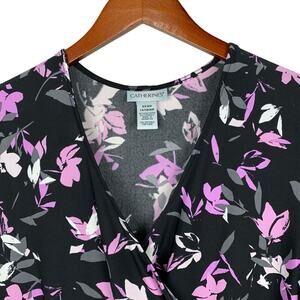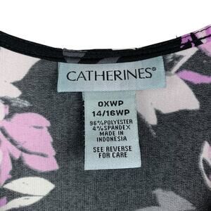 Catherine's faux wrap maxi dress in women's size 14/16WP. 3/4 length sleeves. Stretchy black and purple floral 96% polyester 4% spandex. Machine washable. Great condition!
