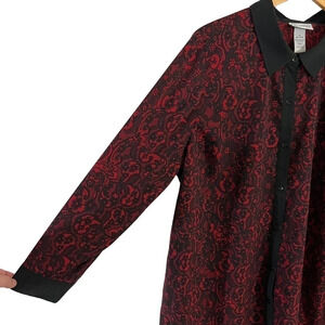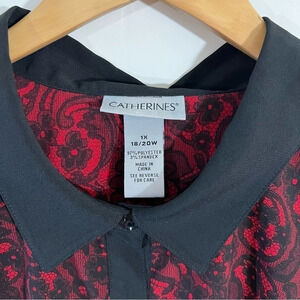 Catherines Floral Button Up Shirt 1X Black and Red Roll Tab Sleeves Lightweight