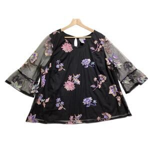 Catherine’s Floral Embroidered Mesh Overlay Top Blouse Sz 1XP Black