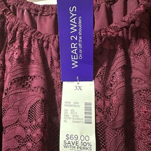 Catherines Lace Blouse On / Off The Shoulder Size 3X 26 28W Burgundy Red NWT