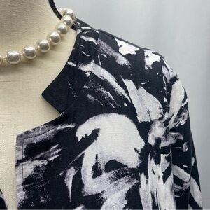 Elegant monochrome floral Linen blend jacket. Versatile and chic. Pockets, lined and 3/4 sleeves.