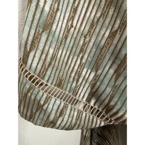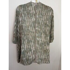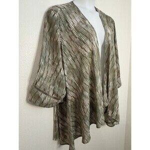 This Catherines Open Front Kimono Top Blouse in size 4X is a versatile and stylish piece perfect for work, office, or casual wear. The bohemian-inspired design with crochet detailing adds a touch of flair, while the green and brown striped pattern gives it a unique and colorful look. Featuring a V-neck and 3/4 bell sleeves, this blouse is lightweight, breathable, and machine washable, making it ideal for all seasons. The kimono style and chiffon fabric add a touch of elegance, making it a great option for various occasions. Perfect for those who love a blend of classic and bohemian styles. Top is an excellent preowned condition with no obvious flaws holes or stains. Measurements in photos. I appreciate your business and strive for a five star rating. Please feel free to message with questions.