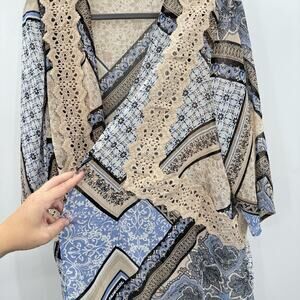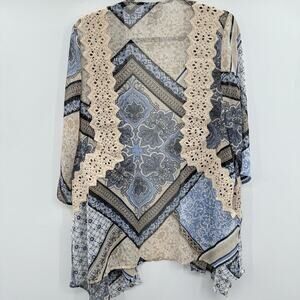 Catherines Patchwork Floral Crochet Sheer Kimono Topper 14/16W Blue Beige Boho
