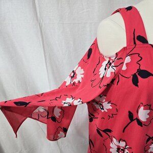 Good used condition, with no stains or tears. A vibrant pink floral blouse, with cold shoulders. Has a square neck with 3 triangle cutouts at the chest. The bodice is lined and the sleeves have slits.