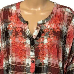 Catherines Pink Plaid Embroidered Henley Blouse 3XWP Petite Gold Metallic Thread