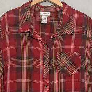 Catherines roll tab sleeve button up reds and browns plaid rayon shirt in Excellent pre-owned condition!