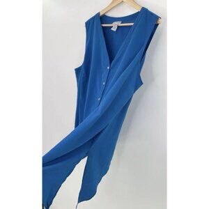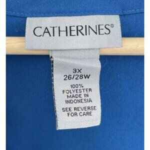This Catherines blouse is a stylish addition to any wardrobe, featuring a V-neckline and asymmetrical hem in a beautiful blue chiffon fabric. The sleeveless design and collarless style make it versatile for various occasions, from casual outings to formal events. With a button closure and accents, this blouse offers a classic and colorful look with a touch of bohemian flair, making it a perfect choice for summer, fall, or spring wear in sizes up to 3x. Good used condition. No stains or holes found. Please feel free to ask any questions.