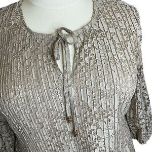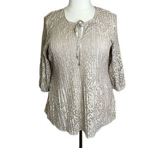 Catherines Plus Size Lacy Blouse Size 1X Pullover Pleated Tan. A gorgeous blouse in a lovely tan color. 3/4 sleeves with elastic cuffs. The neck has a tie closure with a keyhole opening. The lace is pleated and the top is lined except for the sleeves. Stretchy. Excellent, like new condition.