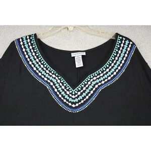 This is a Catherine's Rayon T-Shirt that is embroidered around the neckline. It has short sleeves that tie. It is a size 3X(26-28W). It is 95% Rayon and 5% Spandex. Laying flat, it measures: Armpit to armpit-29" and the length is 32". In good condition.