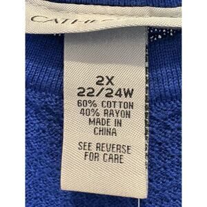This Catherines Royal Blue Textured Cold Shoulder Sweater in size 2X is a stylish and versatile piece for any wardrobe. The 3/4 sleeves and open-knit design give it a modern and on-trend look, while the round neckline adds a touch of classic elegance. Made from a comfortable blend of rayon and cotton, this sweater is perfect for various occasions including travel, parties, casual outings, and workwear. The crochet accents add a pop of detail and the lightweight, stretchy fabric ensures a comfortable fit for all-day wear. Perfect for summer, fall, and spring, this sweater is a must-have for any plus-size woman looking to stay chic and comfortable. Chest 25 1/2”. Length 35”.