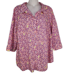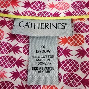 Catherines Shirt Top Womens Size 1X White Pink Pineapple Button Front 3/4 Sleeve