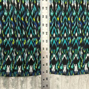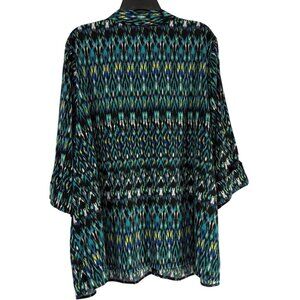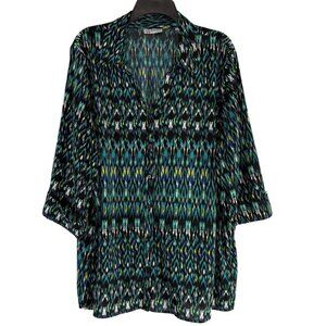 Catherines Womens Plus 2X Button-Up Blouse Cuffed Sleeve Blue Green Ikat Abstract Top
