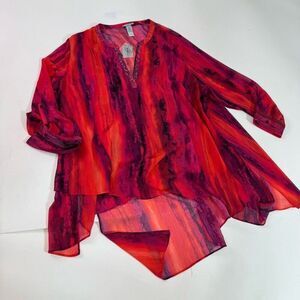 Catherine's Shirt Womens 3X Red Sheer Tunic Top Beaded Flowy Asymmetric Hem New