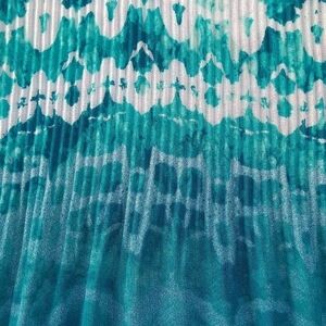 Good used condition, with no stains or tears. A bold boho teal blouse, with abstract geo shapes. Has an ombre effect, pleated accordion design, beaded v-neck, and short flutter sleeves. Semi-sheer.