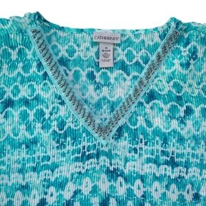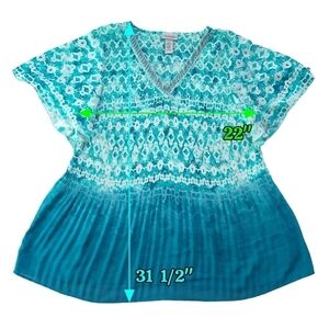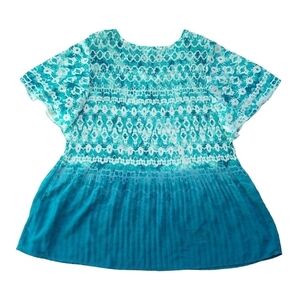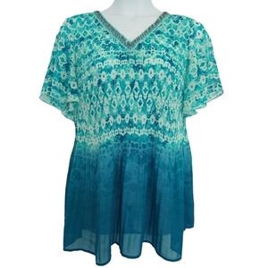 Catherines Teal Aqua Pleated Beaded V-Neck Flutter Sleeve Ombre Tunic Beachy