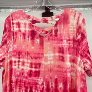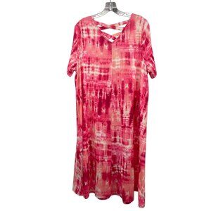 Catherines Tie Dye Midi Shift Dress Short Sleeve Lattice Back Pink/Multi Size 0X