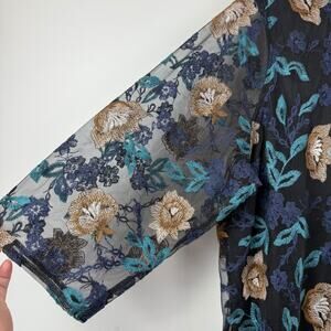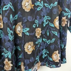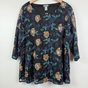 Catherines Top Womens 2X Black Multi Embroidered Floral Sheer 3/4 Sleeve Blouse
